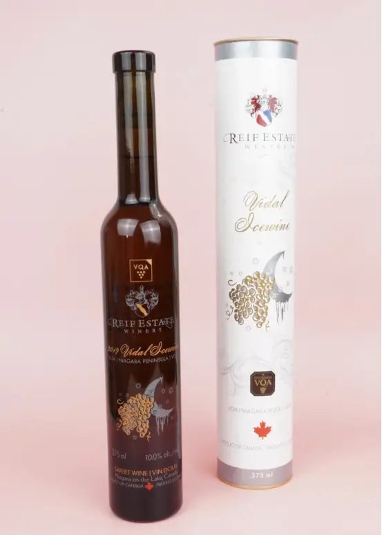 Vidal Icewine ist ein Wein, der aus der Gärung von Trauben hergestellt wird, die aus den Weinbergen der Reif Estate Winery in Kanada geerntet wurden. Eiswein wird aus Trauben hergestellt, die am Rebstock gefrieren gelassen werden. Der Frost, der sich auf natürliche Weise in diesen kanadischen Rebsorten festsetzt, erzeugt spektakuläre Aromen. Die Trauben werden dann zerkleinert und aus diesem vergorenen Saft wird der berühmte Eiswein hergestellt.