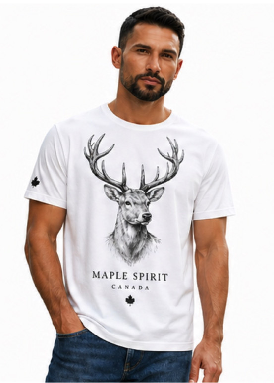 Inspiriert von den weiten kanadischen Landschaften, Herren-T-Shirt „Maple Spirit“ verkörpert durch seine visuelle Anziehungskraft Kraft und Eleganz. majestätischer HirschEin schlichtes und raffiniertes Design für einen zeitlosen Stil.