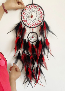 Tauchen Sie ein in die Magie der indianischen Traditionen mit diesem handgemachter Traumfänger 70 cm lang. Handgewebt, verziert mit flammende schwarze und orange Federn, es filtert Energien und schützt den Schlaf, indem es nur gute Träume durchlässt. Ein echtes Dekorationsobjekt voller Symbolik und Süße.