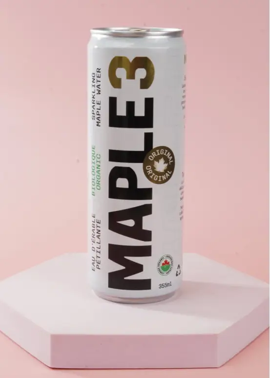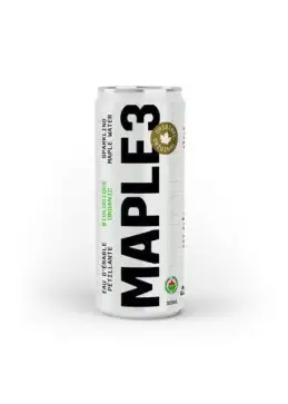 This sparkling maple water from the Maple 3 brand is packaged in a 355 ml can. It consists of only two ingredients: organic maple water and malic acid.
