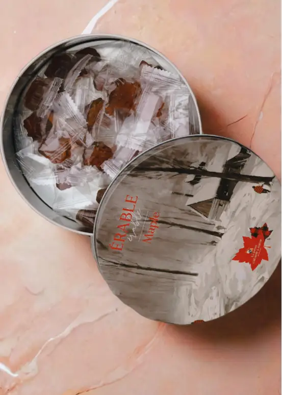Con su diseño único, esta caja redonda de metal con los colores de Canadá es mucho más que un simple contenedor: es una pieza de colección y un homenaje al patrimonio canadiense. Relleno de 30 caramelos de sirope de arce 100 % puro, garantiza un placer gustativo incomparable. Una idea de regalo que combina indulgencia y autenticidad, para una dulce experiencia que atraerá a grandes y pequeños.