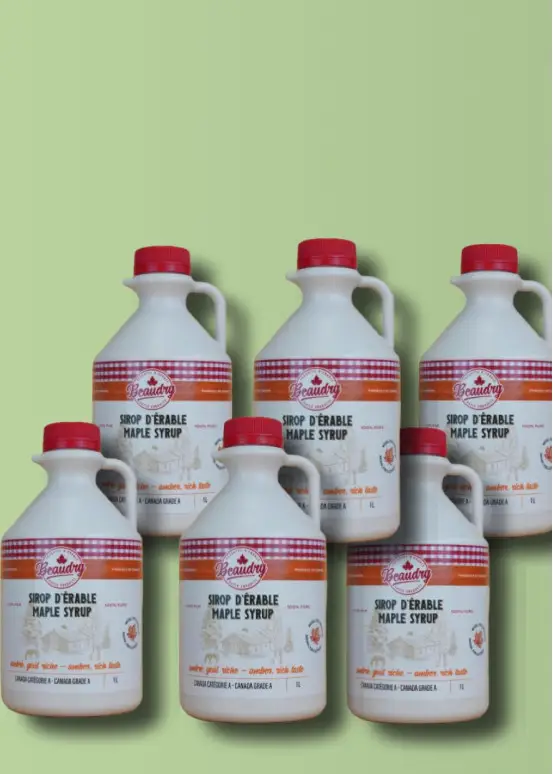 A continuación se muestra un juego de seis jarras de jarabe de arce color ámbar, de un tamaño generoso de un litro por jarra.