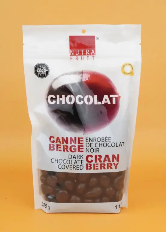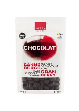 La canneberge est un aliment particulièrement sucré d’origine québécoise. Également connue sous le nom de petit fruit rouge d’Amérique du Nord, elle est présente dans de nombreuses recettes. Enrobée de chocolat noir, la baie de cranberry vous livre de délicieuses saveurs. Que ce soit pour apporter de la douceur à vos desserts ou pour concocter des amuses bouches, elle saura vous satisfaire. Le conditionnement du produit se fait dans un sachet en plastique, ce qui facilite son transport et son rangement.