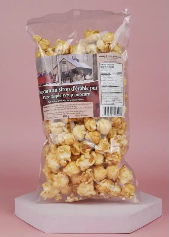 Délicieusement sucré et authentiquement québécois, le popcorn gourmet au sirop d'érable donne une touche de raffinement à vos soirées cinéma. Il est présenté dans un sac plastique transparent qu'il sera difficile de refermer sans avoir à en vider le contenu !