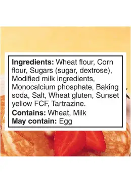 Farine de blé, farine de mais, sucres, substances laitières modifiées, phosphate monocyclique , bicarbonate de sodium, sel, gluten de blé, jaune soleil FCF, tartrazine. Contient du blé, lait.