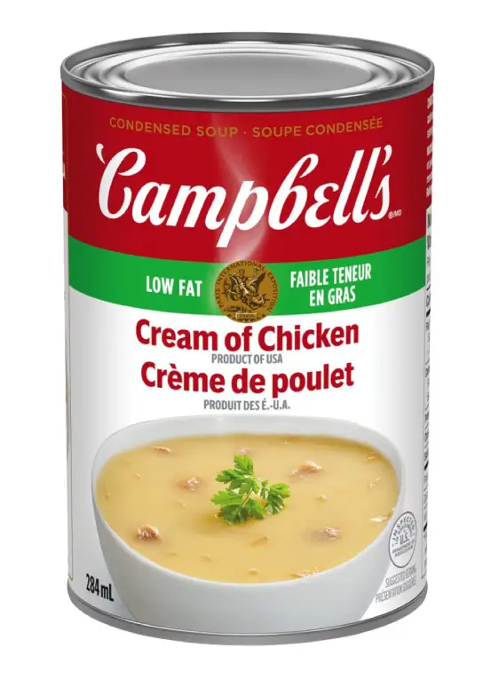 Là Crema di zuppa di pollo Campbell, un'alternativa sana e gustosa, offre una consistenza cremosa e un autentico gusto di pollo. A basso contenuto di grassi e senza aromi artificiali, è perfetto per un pasto confortante o come base per le tue ricette preferite.