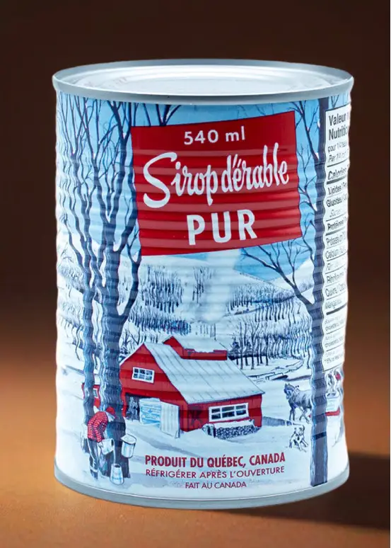 Amberkleurige ahornsiroop in metalen blikje