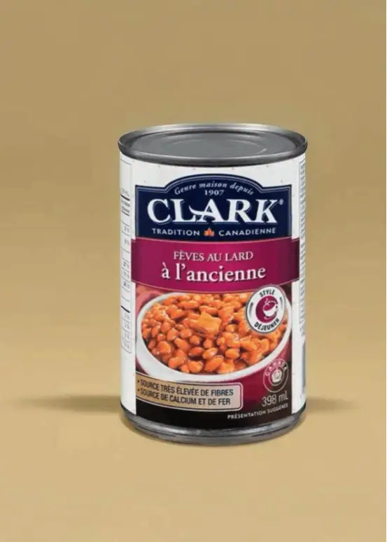 Clark's Old Fashioned Baked Beans, licht gezoet met bruine suiker, worden gemaakt zoals onze grootmoeders dat deden. Goed verfraaid met peper, kruiden en spek, ze zijn net zo geruststellend als een Quebec-maaltijd van weleer.